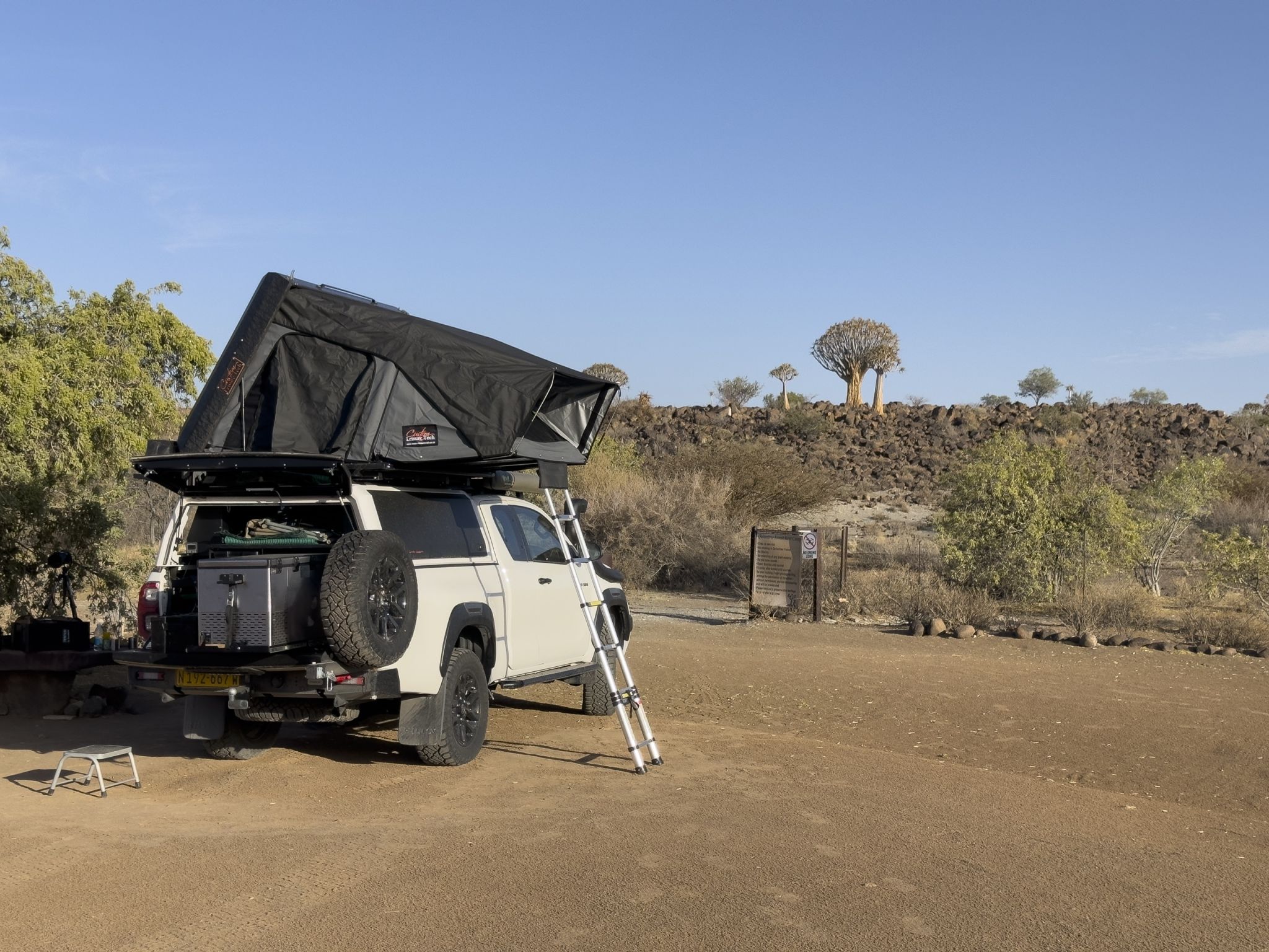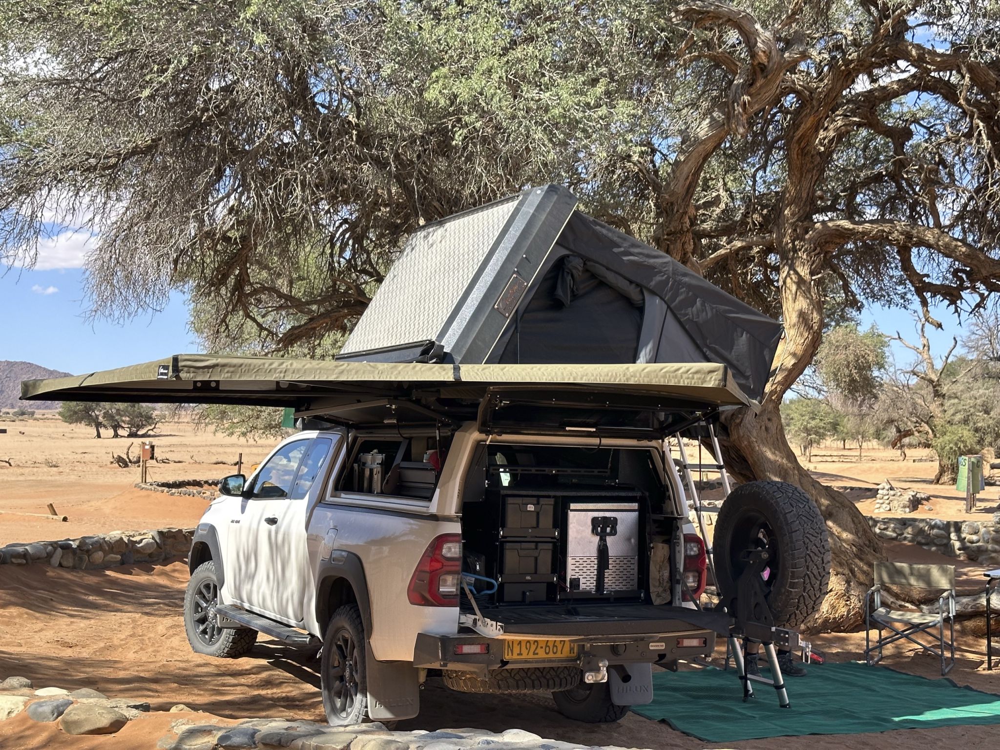 Fitted with a powerful auxiliary battery system featuring DC-to-DC charging and dual 120W solar panels, a generous 110-litre fresh water tank, a 90-litre fridge/freezer, and a full recovery kit, this Hilux is ready for extended adventures where there’s no cell signal, no power lines, and no neighbours. The ostrich wing awning provides quick, reliable shade and sun protection, while the upgraded suspension and higher payload capacity ensure a smooth, capable ride across sand, gravel, and rocky tracks.